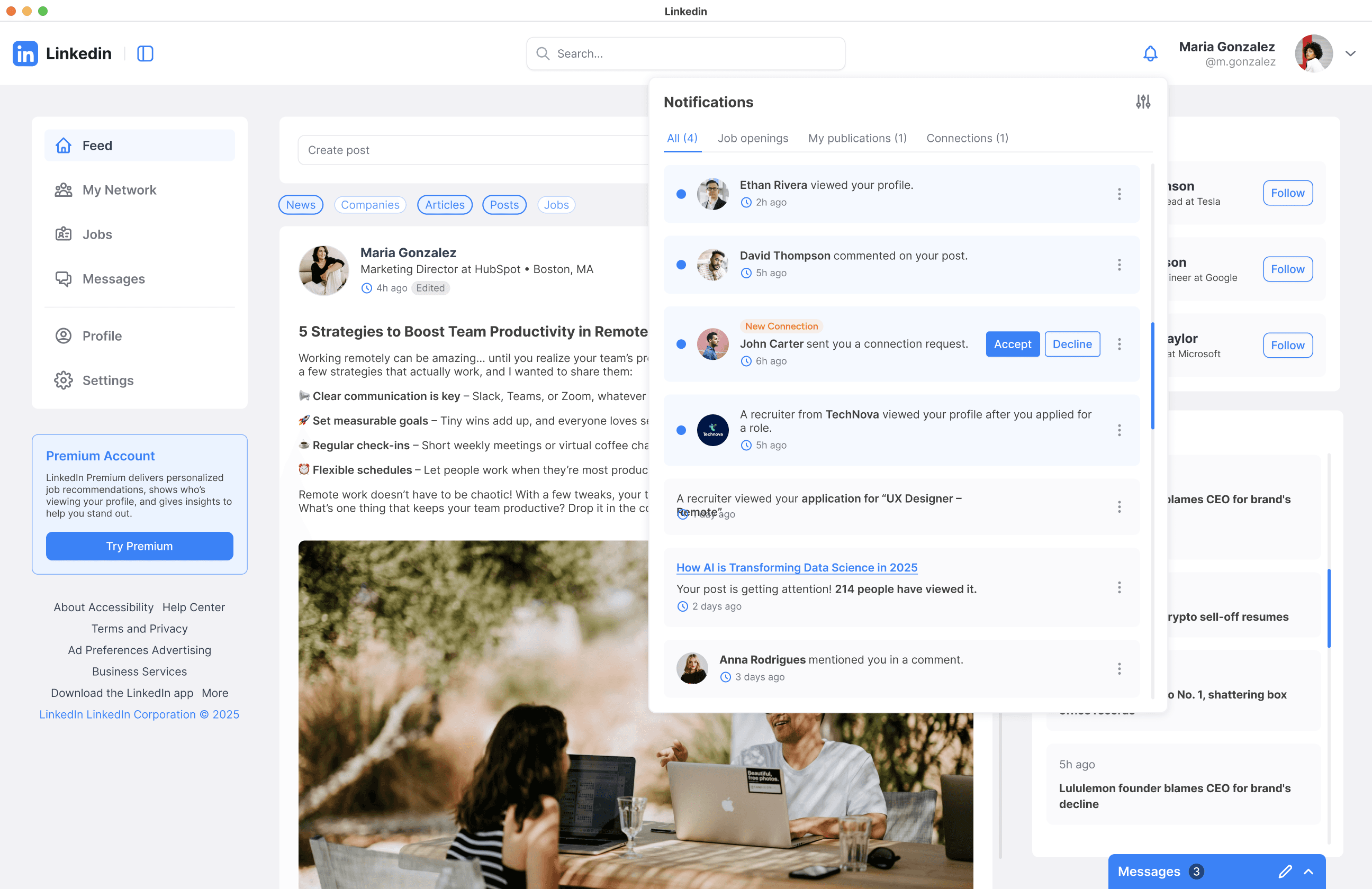 Users receive too many notifications (posts, likes, job alerts, connection updates) without sufficient control or prioritization.