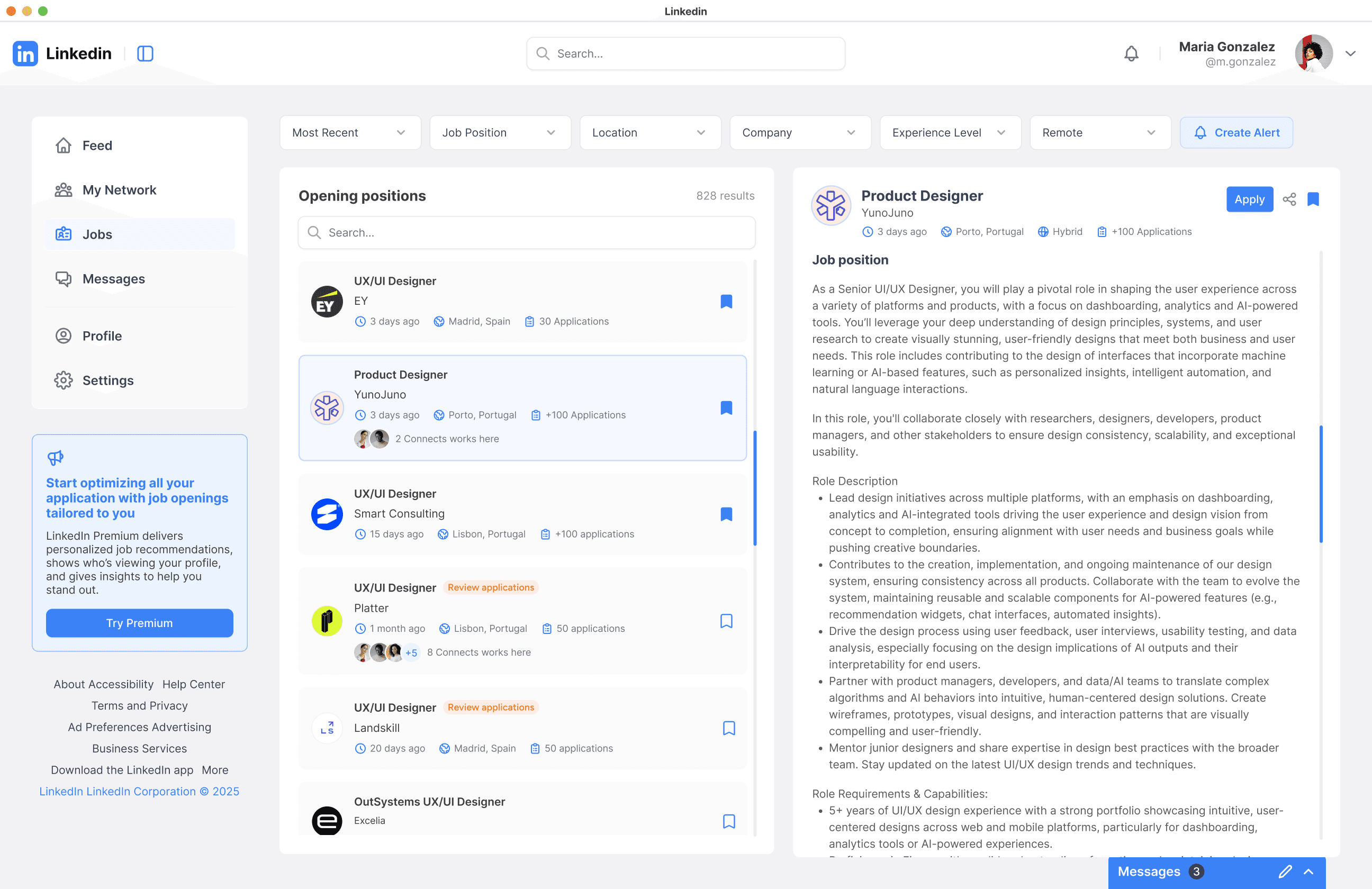 The LinkedIn job application flow allows users to search for positions, view job details, and apply directly through the platform. While convenient, the process can be inconsistent across listings, with some requiring external sites and others offering limited resume or portfolio support.