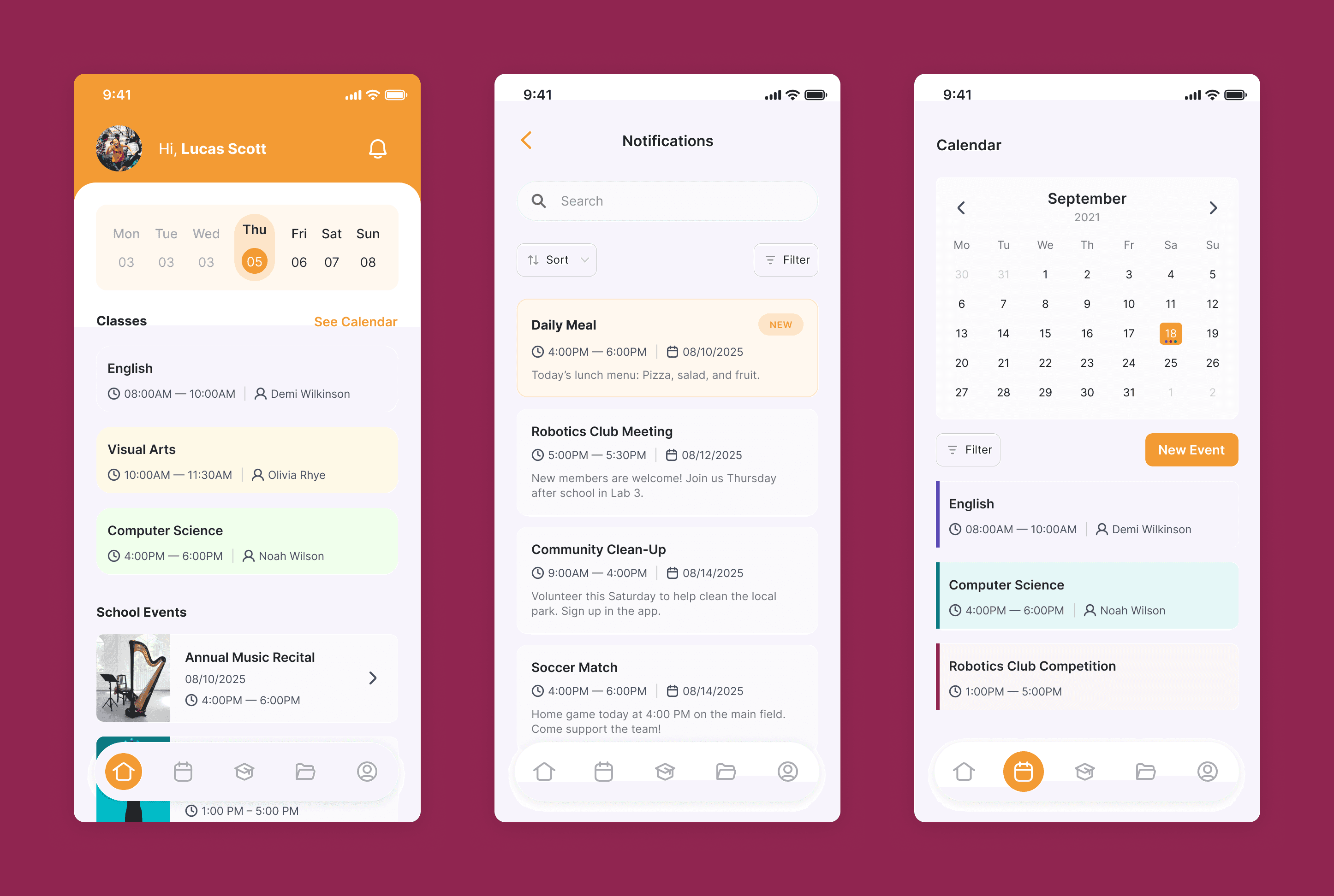When users open the app, they are directed to the home page, which provides an overview of the current day, including classes, events, and notifications.