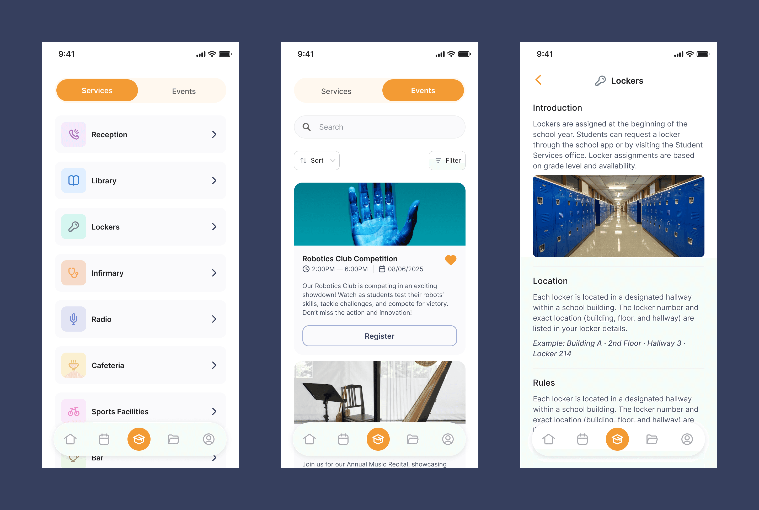 The services and events section brings all of the school’s offerings together in one place. In the services tab, users can see the details for each service, like schedules, locations, and other important info. The events tab lists all the school-organized events, making it easy to stay updated and involved in campus life.